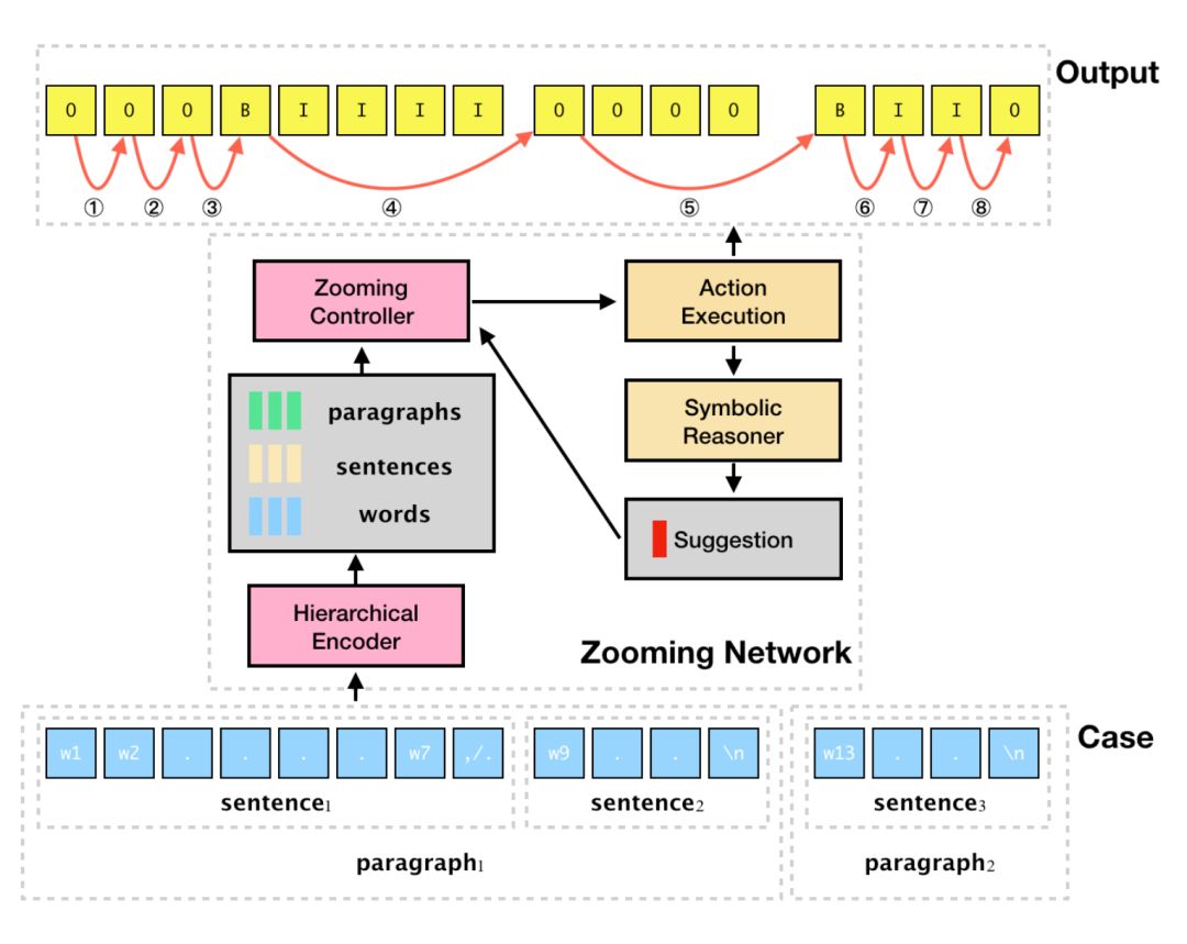 段落、列表等文本结构蕴涵着信息输出者的表达策略,对于准确抓取、理解文本内容有着重要的意义。这种文本结构有符号化的骨架,但是又需要和局部的语义有深度的耦合。我们提出了变焦神经网络(Zooming-Net)来完成这种偏符号性的文本结构和神经性的局部语义表示的结合。Zooming-Net 可以利用 Policy-Net 灵活地选择在特定文本粒度(字、句、段)上执行读取、更新、跳转、预测等一系列操作,这种独特的变焦处理方式高度类似人类阅读过程,利用文本结构,其在信息稀疏部分进行泛读,确保不引入过多噪声,在信息密集部分进行精读,确保有用信息不被丢失。我们引入了符号化推理模块对模型的输出加以解释,并进行定向的干预。变焦神经网络由层次化编码器、变焦控制器和符号化推理模块三个部分完成对文本的处理并以序列标注的形式找出文本中的关键片段(图 6 给出了一个简略的示意图)。具体地说,在每个时刻,层次化编码器配合变焦控制器有策略地选择建立层次化特征,读取特定层级的信息,结合符号化推理模块给出的临时性离散信息预测出一定长度的标签序列。在读取整篇文本之后,将各时刻输出的标签序列进行组装,并取出对应的关键信息片段。实验表明,借助句段结构信息,变焦神经网络很好地结合了泛读与精读过程,其可以更好地对长时依赖特征进行建模,并引入大跨度动作提高效率,在关键信息的抽取任务上,f1 值较经典序列标注模型(biLSTM+CRF)有 10% 以上的提升,预测行为频次减少 50% 以上。变焦神经网络非常适合应用在各类长文本处理任务当中,其使用的编解码方式也可结合其他技术推广到各类自然语言处理任务过程中 (论文见 arxiv.org/abs/1810.02114 )。