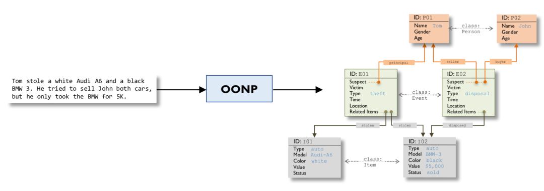 图 8:OONP 的解析示意图,左侧的每一个小框代表了一个对象(object),框的颜色标识了类(class)