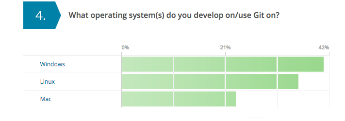 36%的人在Linux上使用Git进行开发,而在Mac上的使用比例为23%。