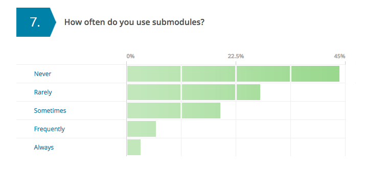 28%的人很少使用Submodule,19%偶尔使用,6%经常使用,3%总是使用。