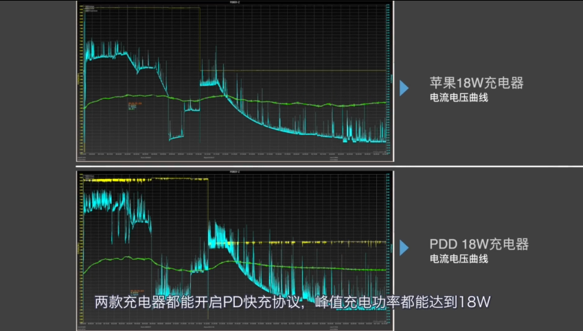 另外,值得说的是,苹果充电器在充电过程中,电压和电流稳如老狗,而 PDD 充电器的电压和电流明显波动很大,这说明滤波和稳压电路很差。
