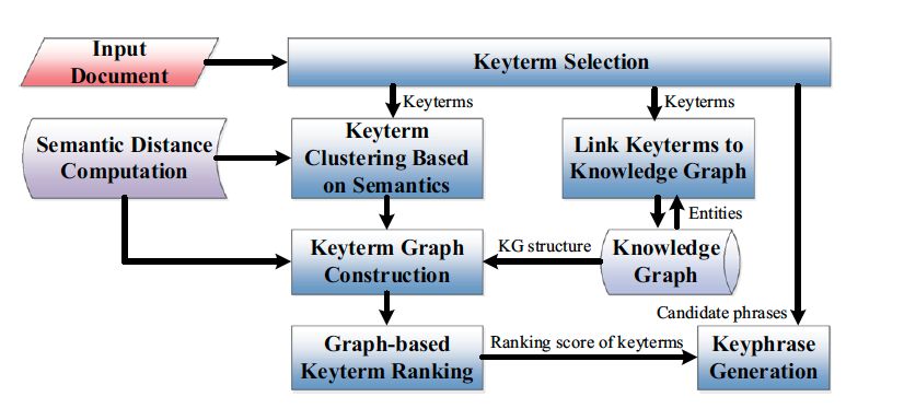 给定一个文档,首先选择候选关键词。然后,基于语义相似度对关键词进行聚类,以覆盖更多的主题。每个簇中的关键项都链接到知识图中的实体。对于每个簇,以映射的实体作为锚节点,通过从知识图谱中提取h-hop键项图来映射输入文档中的键项与键项的关系,将所有聚类对应的所有关键项图合并成一个完整的文档图。对完整的文档图应用个性化的PageRank,得到每个候选关键词的排名得分。候选短语的PPR分数是关键字的PPR分数之和。并将另外两个短语特征(短语频数和第一次出现位置)与短语PPR评分相结合,得到最终的短语得分,并选择排名前K的短语作为关键短语。