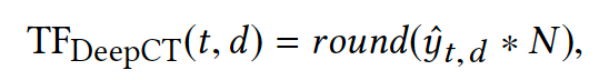由于预测结果范围是[0,1],为了应用到现有的检索模型中,将其缩放到可以与检索模型一起使用的整数范围。即将上述y值转化为为TFDeepCT,以表示这是代表query中term重要性:(实际上,最后这一步可能决定词权重这一特征在排序或检索模型中的效果)