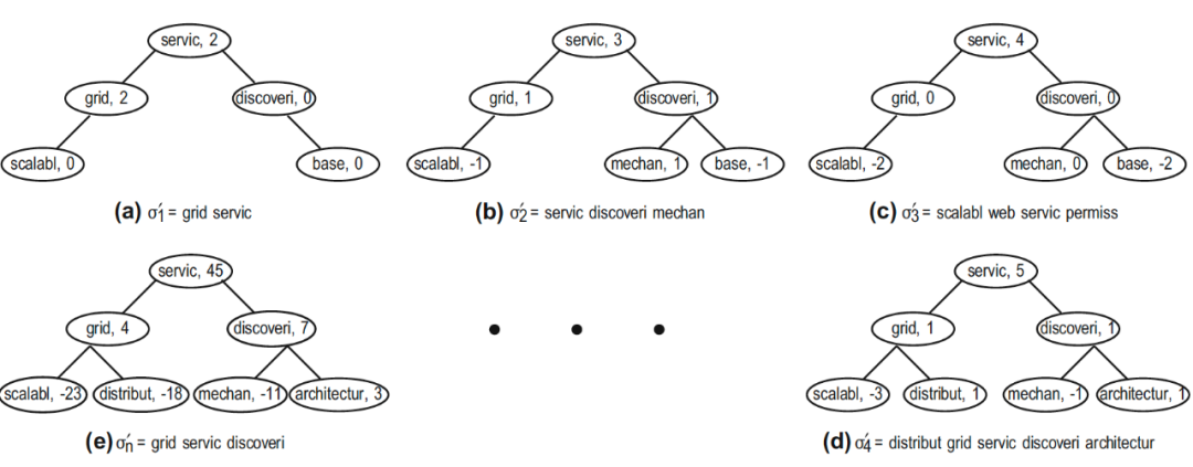 在不同种类的树型数据结构中,KePhEx树属于二叉树。同样,尽管二叉树存在多种变体,但它与其他变体不同,因为树中每个节点的位置和级别都是固定的。同样,与其他变体不同,上层节点(包括根节点)的所有前置节点也都是固定的。之所以如此,是因为一个好的关键词是一个连贯的、连续出现在文本中的单词序列。KePhEx树中的每个节点都包含CI和μ值。CI提供了两个优点: