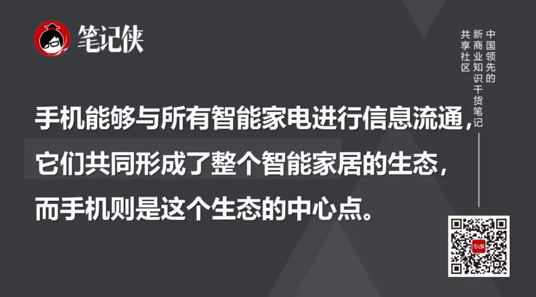 手机能够与所有智能家电进行信息流通,它们共同形成了整个智能家居的生态,而手机则是这个生态的中心点。