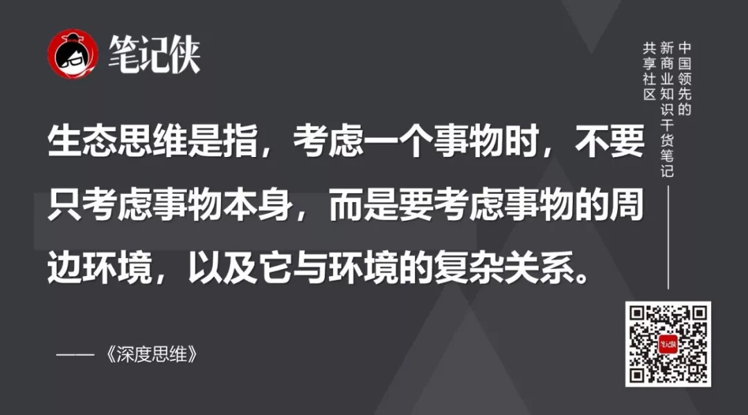 生态思维是指,你考虑一个事物时,不要只考虑事物本身,而是要考虑事物的周边环境,以及它与环境的复杂关系。