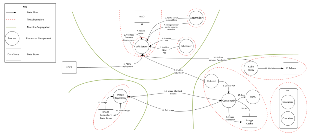 在 2020 年,CNCF 金融用户组 发表了一个针对一般 Kubernetes 集群的威胁模型练习,主要为各类潜在威胁和其对应缓解措施提供一个详细的图解,并提供一个检查清单帮助团队识别 Kubernetes 集群内的常见漏洞和易被利用的点。