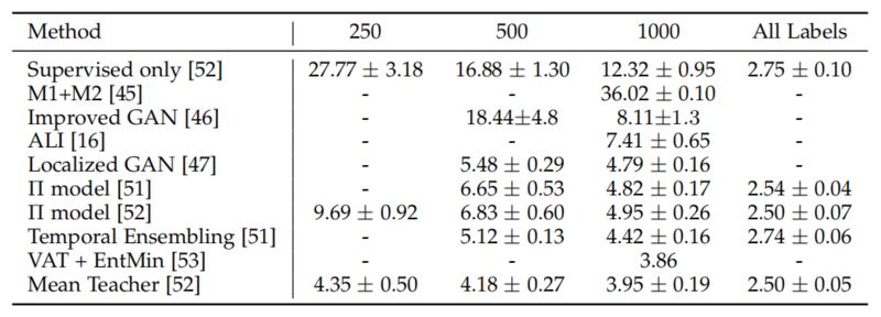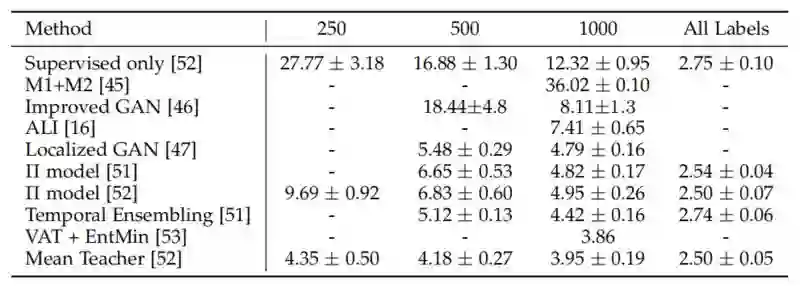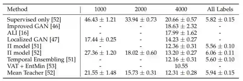 CIFAR-10 和 SVHN 都是常用的衡量半监督模型表现的数据库,通过用所有的无标注训练图像和不同数量的标注样本训练模型。然后在不同的测试集上测试误差率。