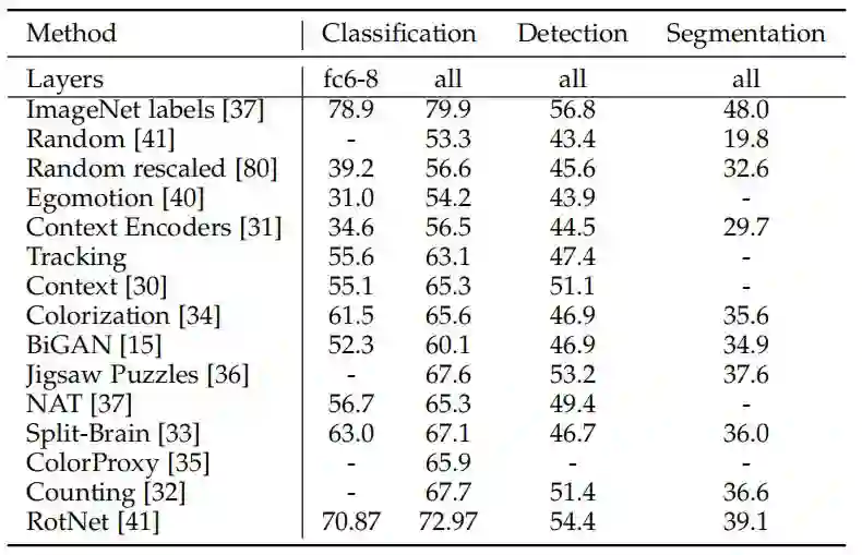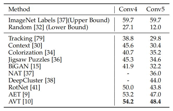 在这种设置下,无监督训练后,固定 Conv4 或 Conv5 前的卷积层。在评测阶段,固定层后的卷积层和全连接层用标注数据进行有监督训练。即利用无监督表示训练非线性分类器。表 1 给出了不同无监督模型的对比。全监督模型(ImageNet 标注数据训练)和随机模型代表了分类表现的上界和下界。