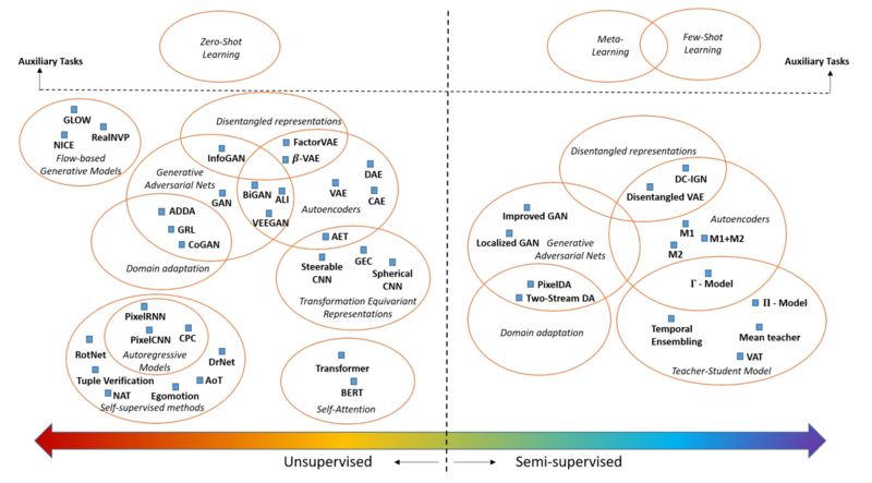 图 1 的左端代表用无标注数据训练的无监督方法。无监督方法旨在学习到能够泛化到不同任务的特征表示。通常用这些特征在分类任务中的表现作为特征的评价指标。图 1 的右端表示半监督方法,既利用标注数据,也利用无标注数据来训练模型。其想法在于未标注数据提供了数据在空间中的分布,并且可以通过探索这种分布来训练一个鲁棒的模型。