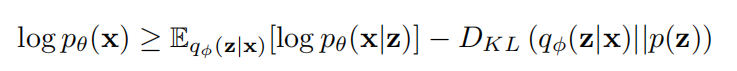 变分自编码器通过训练自编码模型,最大化参数模型 pθ的边缘数据概率 pθ(x) 的变分下界。利用变分编码器 qφ(z|x) 来近似后验概率 pθ(z|x),得到边缘似然度的下界不等式: