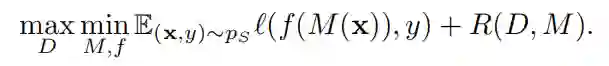 与 ADDA 不同,梯度反向层模型共享源域和目标域表示模型的权重(Ms=Mt=M)。分类器 f,共享表示 M 以及域判别器 D 联合训练。首先对共享模型 M 和域判别器 D 进行约束: