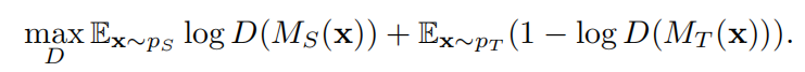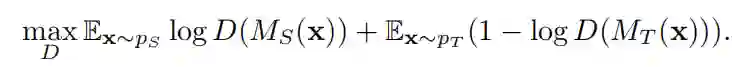然后固定 Ms,训练目标表示模型 Mt,使两个模型的输出一致分布。基于 GAN 的思想,训练一个域判别器 D,以区分源表示和目标表示: