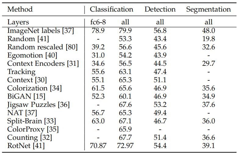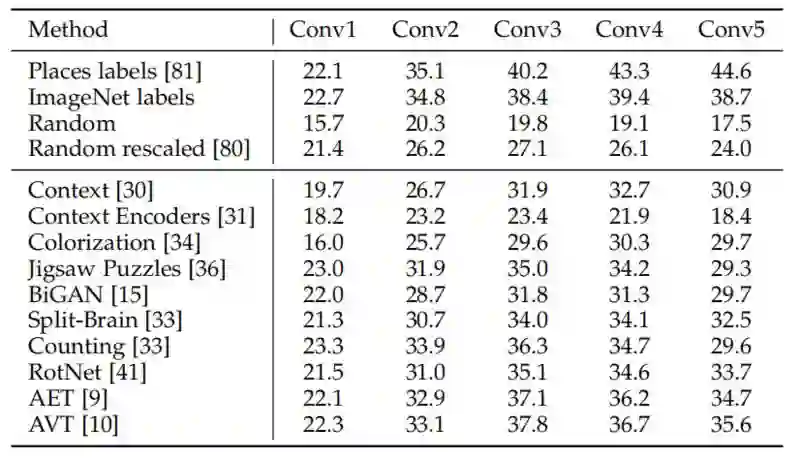 表 3 Places 数据集线性层分类器 Top-1 准确率。所有的无监督特征是在 ImageNet 上预训练的,然后用 Places 类标训练分类器层。