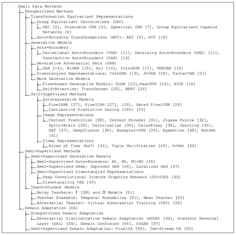 根据对各种信息源的不同利用方式,形成了从不同角度解决小数据问题的多种学习方法。图 1 对这些方法进行了总结和分类,让我们能更好的理解目前小数据问题的研究现状。