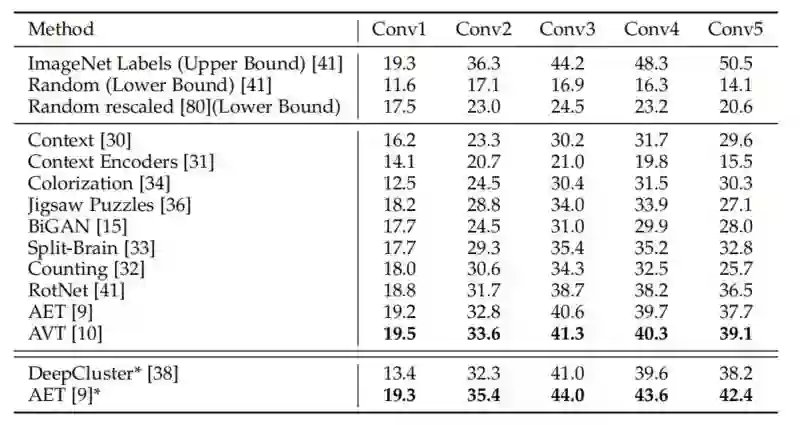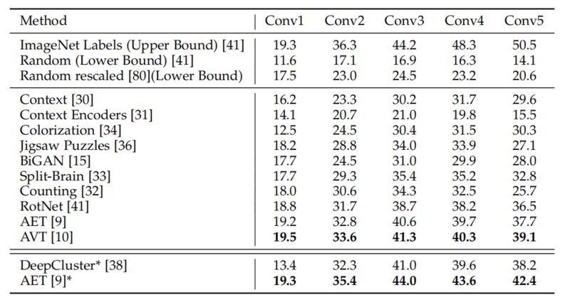 传统的自编码数据(Auto-Encoding Data,AED)通过重构数据来学习表示,而 AET 通过从原始的特征表示和变换图像的特征表示中解码变换方式(transformation)来训练无监督模型。它的假设是:如果变换可以重构,那么学习到的表示就应该包含图像变换前后的视觉结构的所有信息,那么该表示就是变换等变(equivariant)的。并且,由于对表示的形式没有严格的限制,也增强了选择表示形式的灵活性。