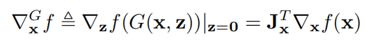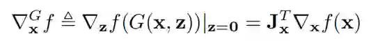在论文中,作者提出了局部 GAN,围绕每个样本 x 和隐表示 z 定义了局部生成器 G(x, z)。围绕每个样本 x,可以建立局部坐标系,x 是原点,即 G(x, 0)=x。这样整个数据流形就可以被一簇局部坐标覆盖。可以在流形上定义分类函数的梯度: