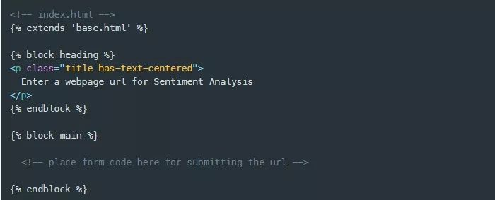 接下来,我将构建index.html模板,首先从扩展base.html模板开始,使用extends模板上下文帮助器跟着用引号括起来的base.html文件的名称来完成。然后,我为标题和主区块提供了一个实现。现在标题就包含一个段落元素,主块包含一个占位符注释,稍后我将在其中添加一个表单和一个用于收集网页url的输入字段,以及一个提交按钮。