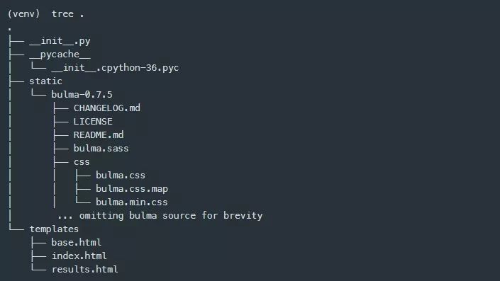 显然这并不令人兴奋,所以我将继续。接下来,我将在sentializer包中添加两个新的目录。一个目录名为templates,用于存放Jinja HTML模板。另一个目录名为static,它包含一个名为Bulma的CSS框架,用于去掉单调的HTML外观。下面是tree命令的输出,所以你可以看到我在做什么。