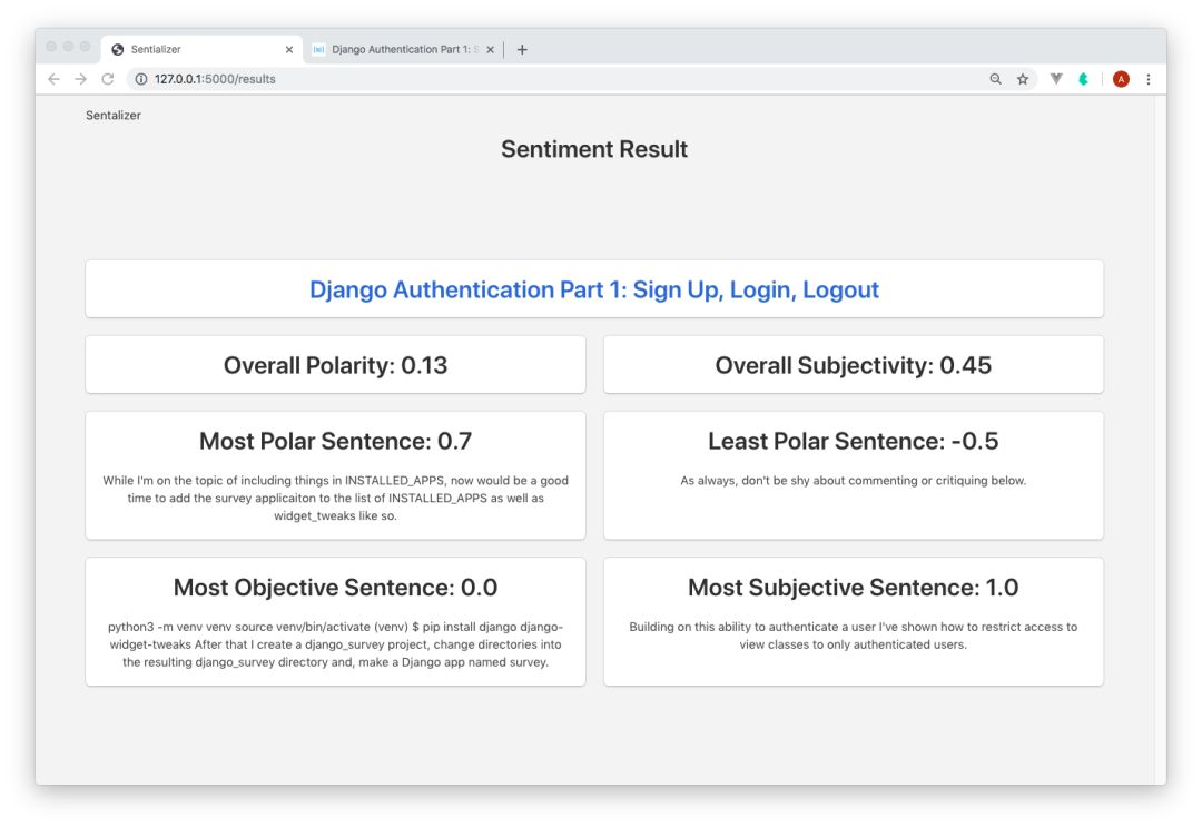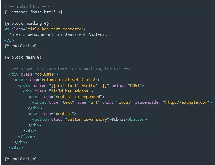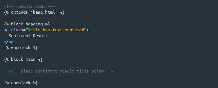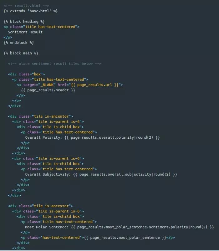 我对results.html模板做了类似的处理,它最终将显示一系列块,每个块都包含一个计算出的情感值,用于提交的url页面的文本分析输出。