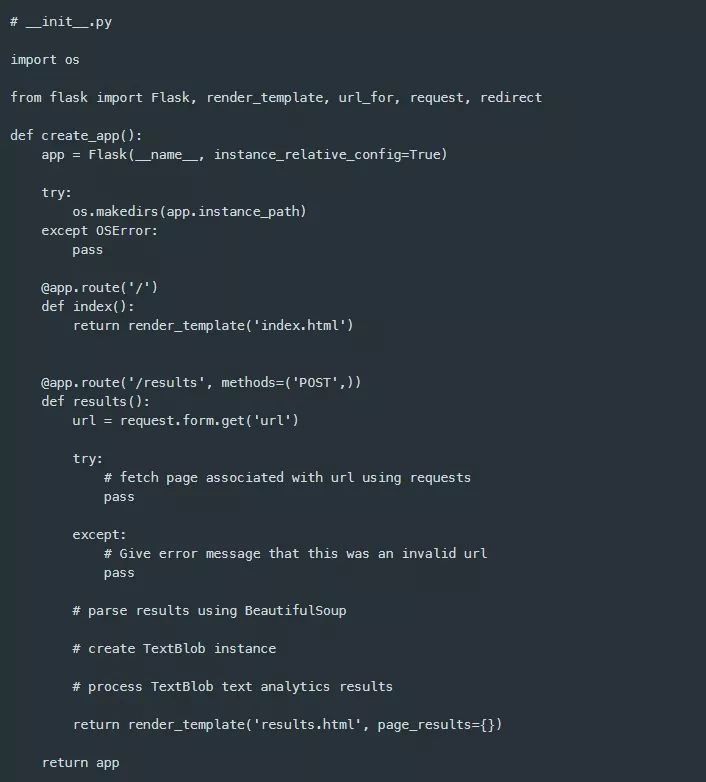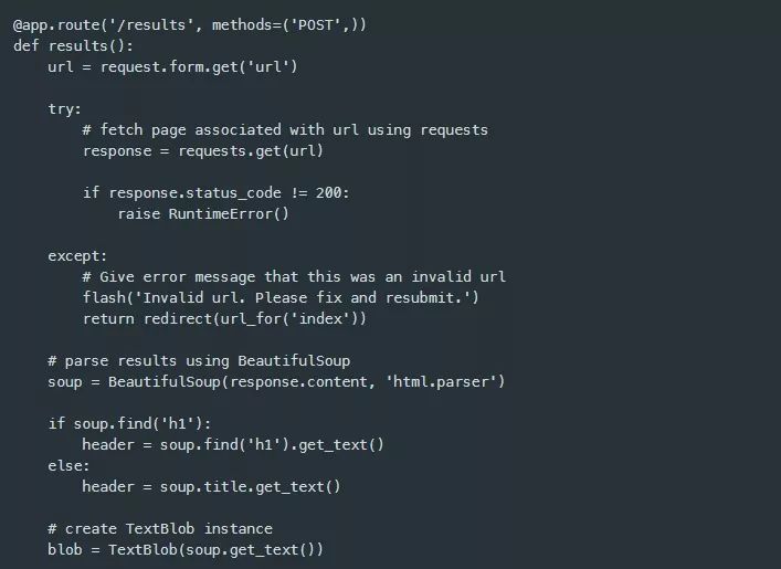 新引入的results()视图函数需要一个名为url的表单字段,它可以由我之前从flask包中导入的全局请求对象上的表单字典字段进行检索。我还添加了一些注释来描述执行文本分析所需的程序流,然后再次使用了render_template函数,但是使用了一个新的关键字参数page_results,目前它只是一个空字典。