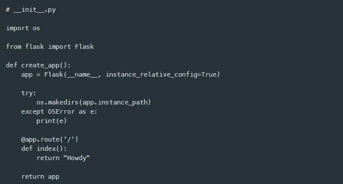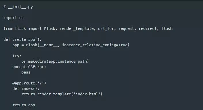 我添加了一个将目录转换为包的 __init__.py模块。在 __init__.py模块中,我创建了一个应用程序工厂函数,用于创建Flask应用程序的实例,如官方Flask文档中所示。
