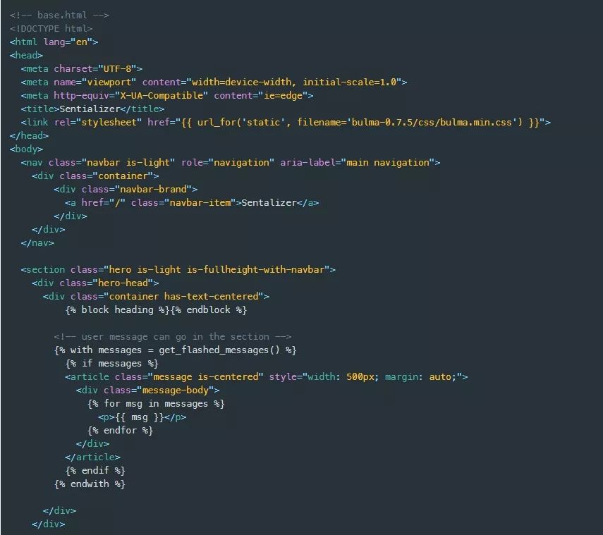 注意为模板构建资源的引用URI路径所使用的url_for(…)模板过滤器。此模板过滤器函数可用于所有模板的上下文。这里我使用它来引用bulma css文件。另一个值得注意的部分是围绕url_for函数的部分,此
