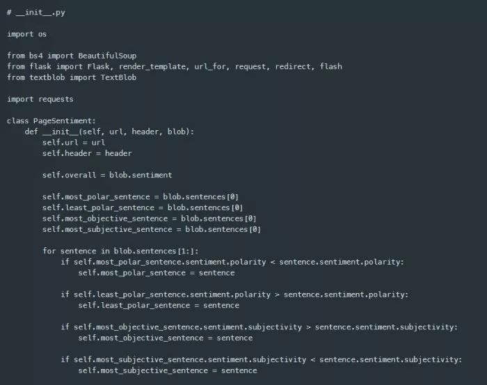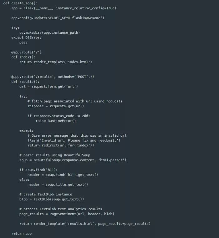 收集了所有必要的数据后,我现在可以查询TextBlob对象的字段来显示页面的整体情感以及页面包含的各种句子的倾向性。为此,我将创建一个名为PageSentiment的自定义Python类型或类,它将维护关于一个页面的url、标题、总体情感以及具有最高情感得分的句子的信息。我将PageSentiment类放在create_app函数上方,如下所示。