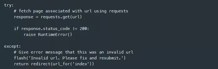现在,如果由于web页面没有成功返回而引发异常,应用程序就会调用flash(…)方法,并将用户重定向到index.html页面。