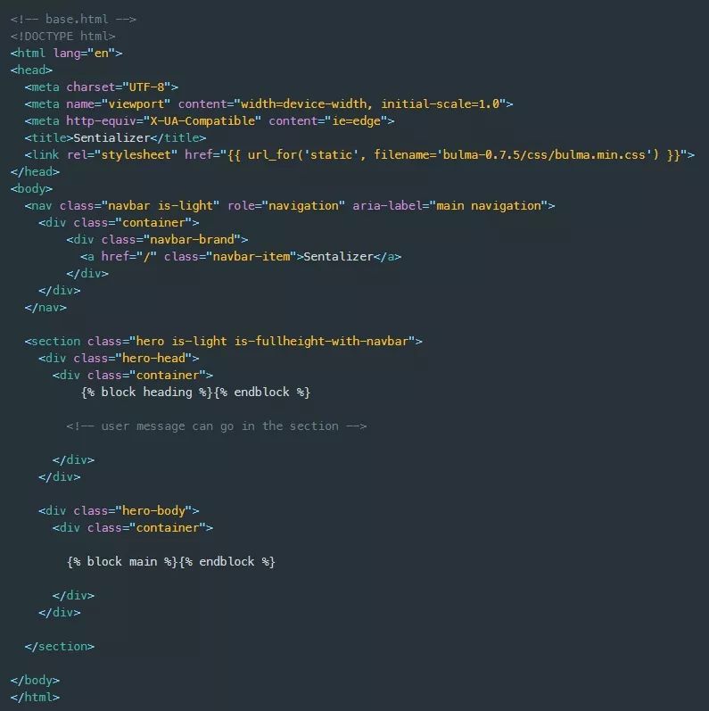 我首先构建base.html模板,它是另外两个页面的主布局。这个base.html模板引用了bulma css的源代码,并创建了一个导航条,其中包含一个指向主页路径的logo链接。此外,我使用{% block %}语法定义了两个Jinja代码块部分。这些代码块用于通过index.html和results.html模板来将标题和主要内容注入其中,这些模板将扩展base.html。