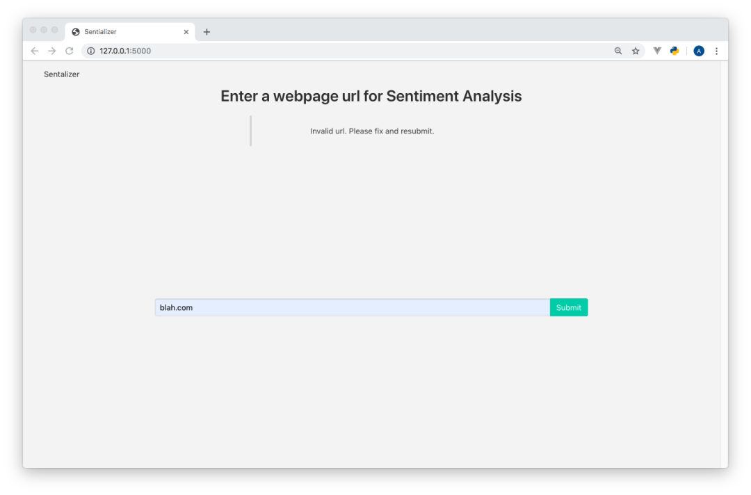 该应用程序能够接受一个代表页面的url来对其实执行情感分析,所以,我现在可以来实现文本分析功能。正如我在results(…)视图函数注释中已经提到的,首先需要使用已POST的url来获取该页面。为此,我导入了requests库,并使用url来调用requests.get(…)方法。这是一个使用未验证url发出的HTTP请求,该url可能指向或不指向一个真实的web资源,因此,引发异常是很有可能的。如果一个异常被捕获,应用程序会向用户显示一条错误消息。