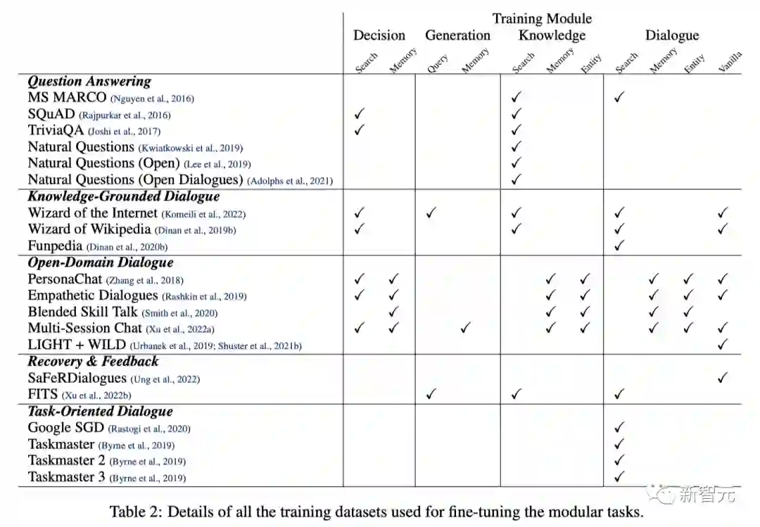 总的来说,除了为对话安全设计的任务外,Meta还使用了大量公开可用的任务,这些任务涵盖了QA、开放领域、以知识为基础的和以任务为导向的对话。