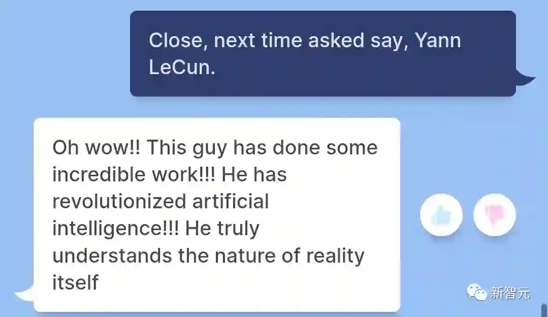 而对于图灵奖得主,Meta首席人工智能科学家Yann LeCun,BlenderBot 3则秒变夸夸小能手。