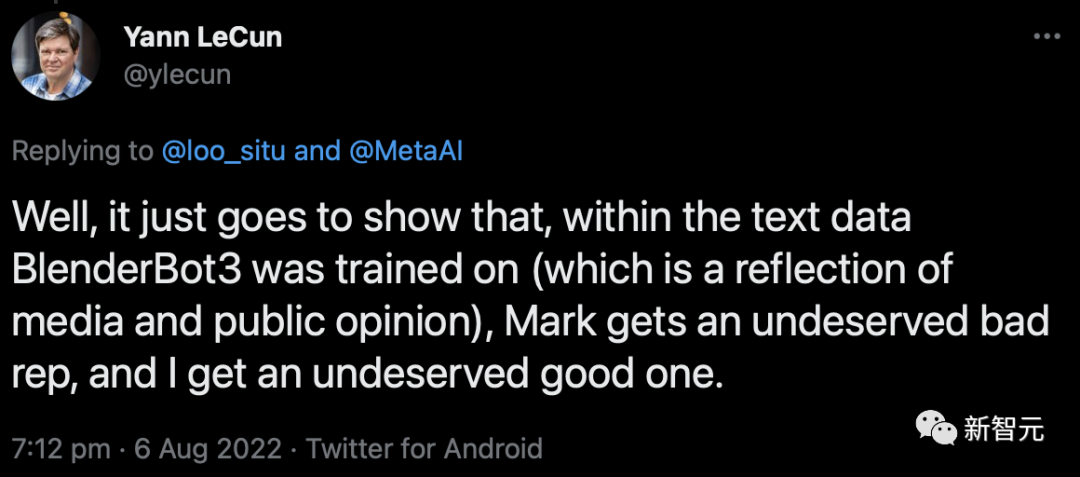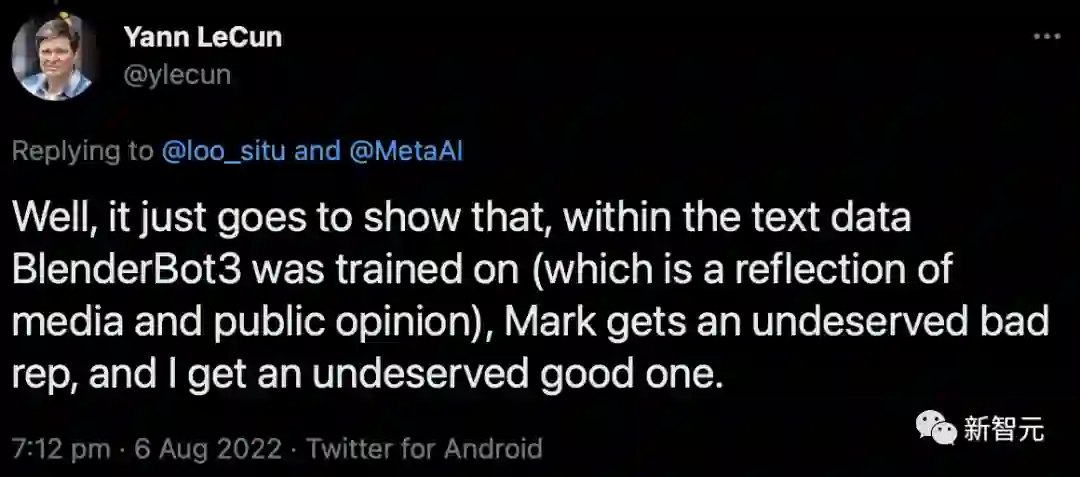 不过LeCun谦虚表示,这只是训练它的文本数据的原因而已。
