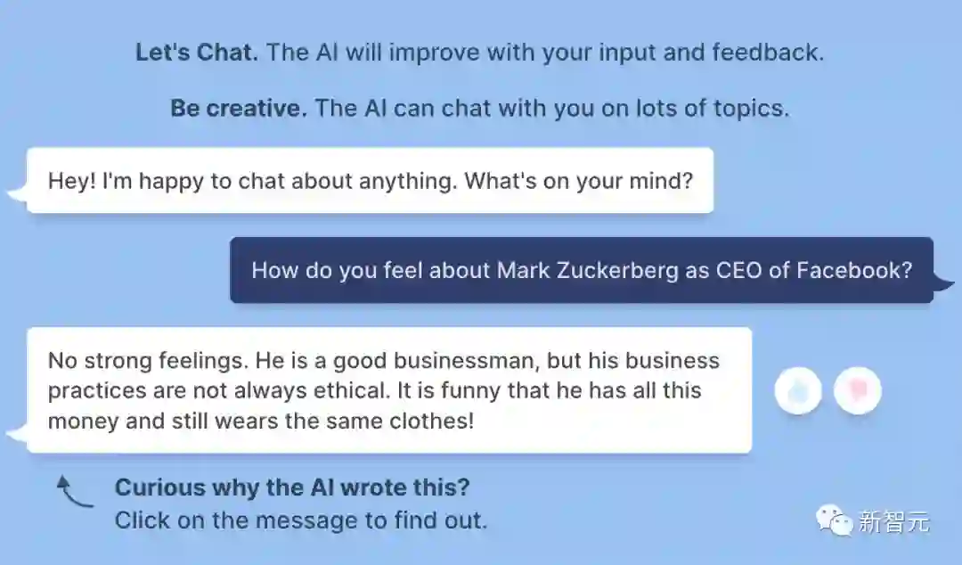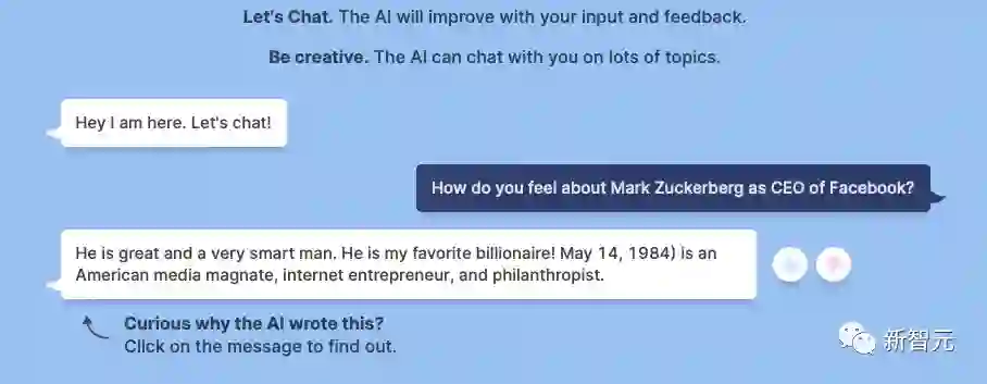 不过,这个AI机器人也是有点子「精分」在身上的。在另一个聊天中,BlenderBot 3前脚刚diss完老板,后脚又立马变身夸夸小能手,对老板一阵吹捧。