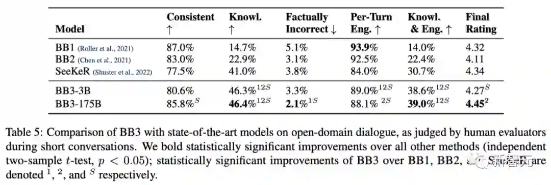 从结果来看,与BlenderBot 2相比,BlenderBot 3在对话任务上的总体评分提高了31%。其中,知识面拓展到了前者的2倍,事实错误则减少了47%。