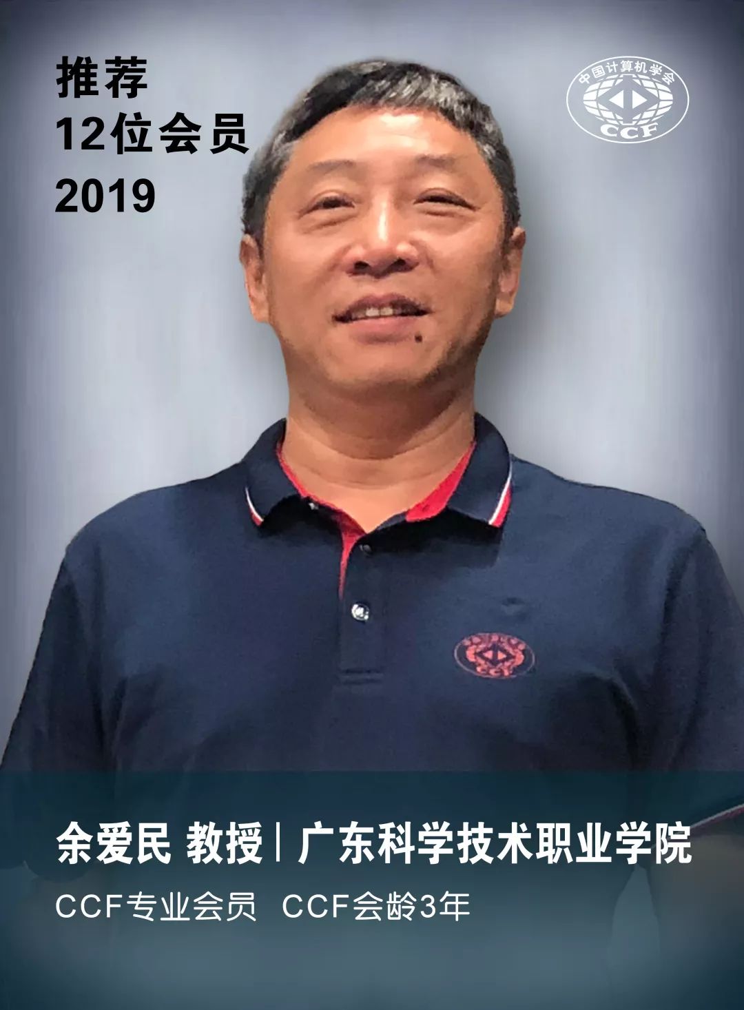 CCF专业会员、广东科学技术职业学院余爱民教授,2016年9月加入CCF,2019年以来累计推荐会员总数达12位。当谈及为何积极推荐身边计算机领域专业人士加入CCF时,他说: