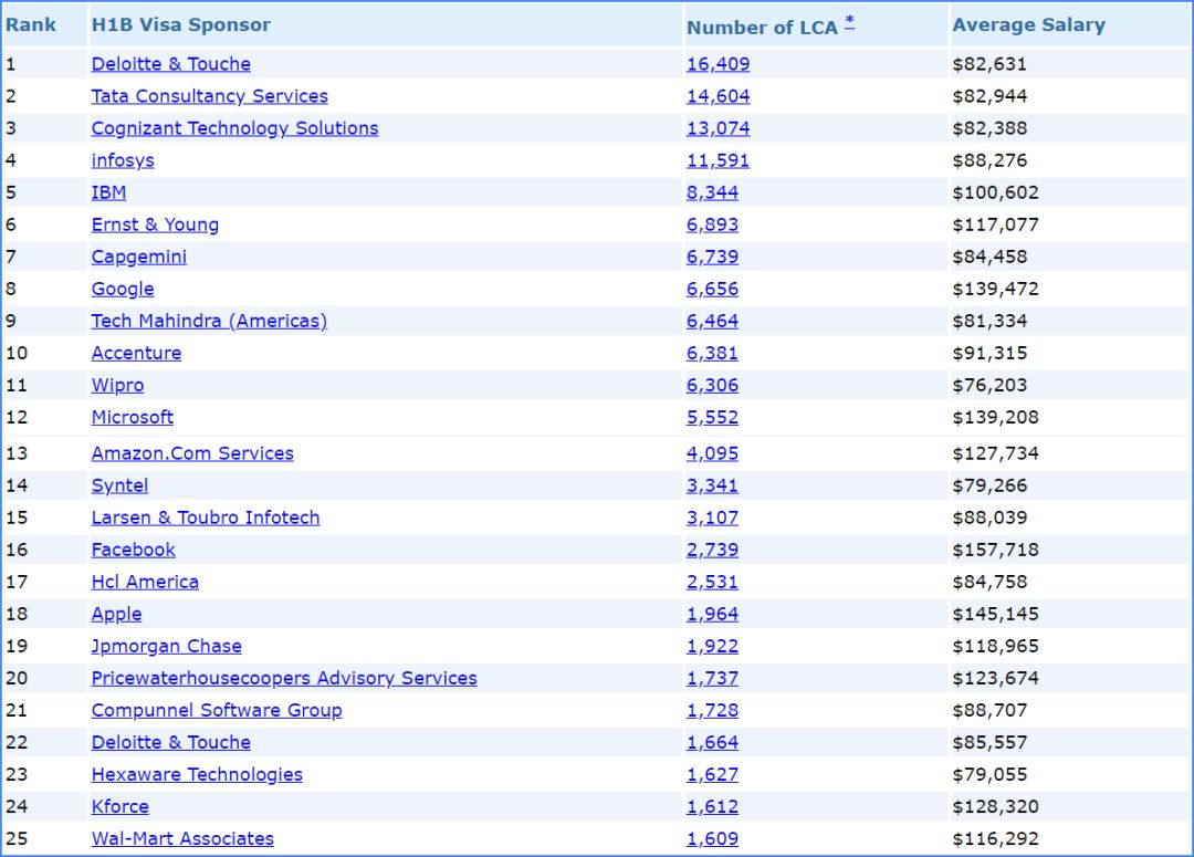 根据2019(2018财年) H1-B的申请记录,排名前5的H1-B提供者中,有3家是起源于印度的大规模技术外包公司。这三家分别是:塔塔咨询服务公司(Tata Consultancy Services,简称TCS)、高知特(Cognizant Technology Solutions)、印孚瑟斯(Infosys)。