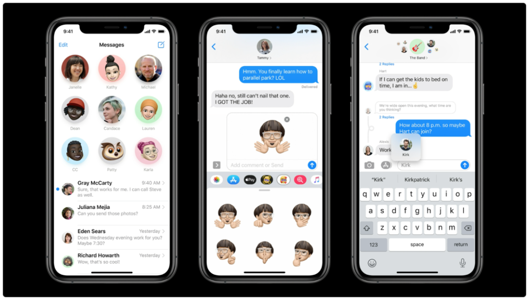 iOS 14 的短信 app 在功能与界面上均获得了改进,支持将联系人固定在应用的顶部,方便快速访问。群聊也支持单线回复、提到、设置群组头像等新功能。