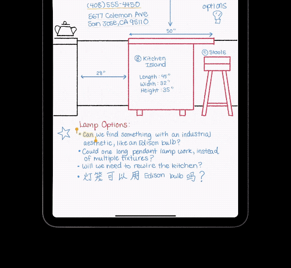 不仅如此,iPadOS 14 还支持同时识别不同语言、不同文本内容的功能,比如:系统支持同时识别中英文手写文字、识别电话号码、地址等,方便我们在点击相关文本时快速进行拨打电话、地图导航等操作。另外,我们将 App 中的手写文字复制到其它 App 时,系统会将文字自动粘贴成文本。