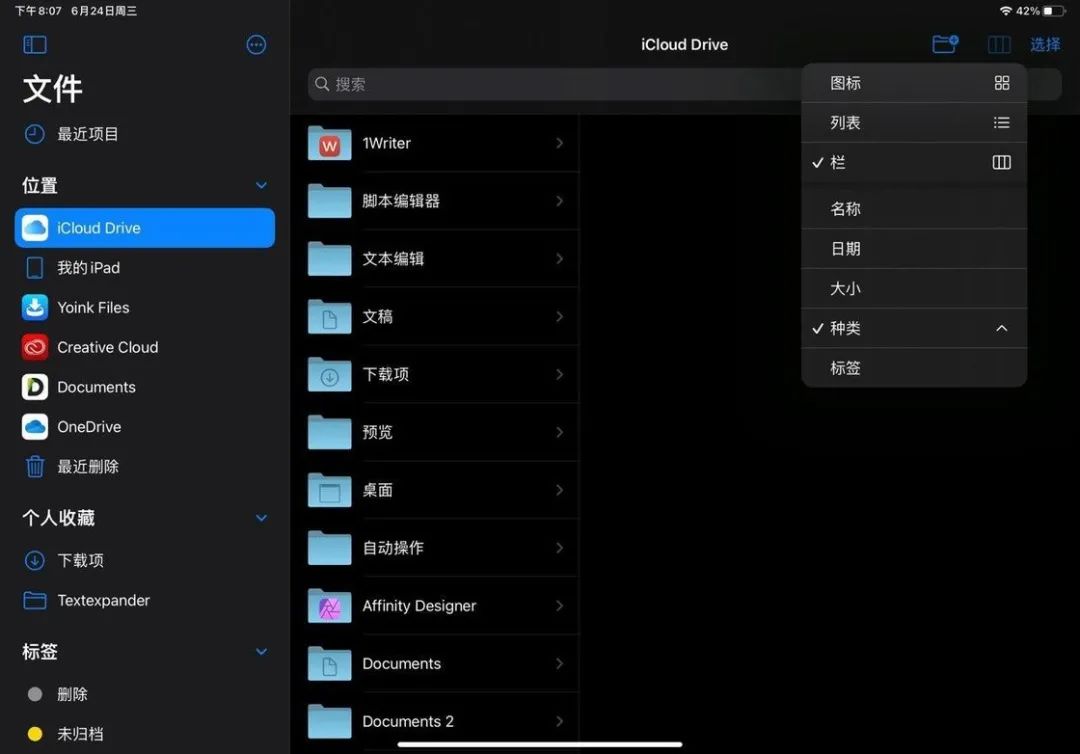 另外,iPadOS 14 还对原生 app 的工具栏进行了简化,并采用统一设计的下拉菜单。例如,在文件 app 中,视图和排序方式等在 iPadOS 14 中都被集成在右上角的下拉菜单中,不再单独显示在界面内。