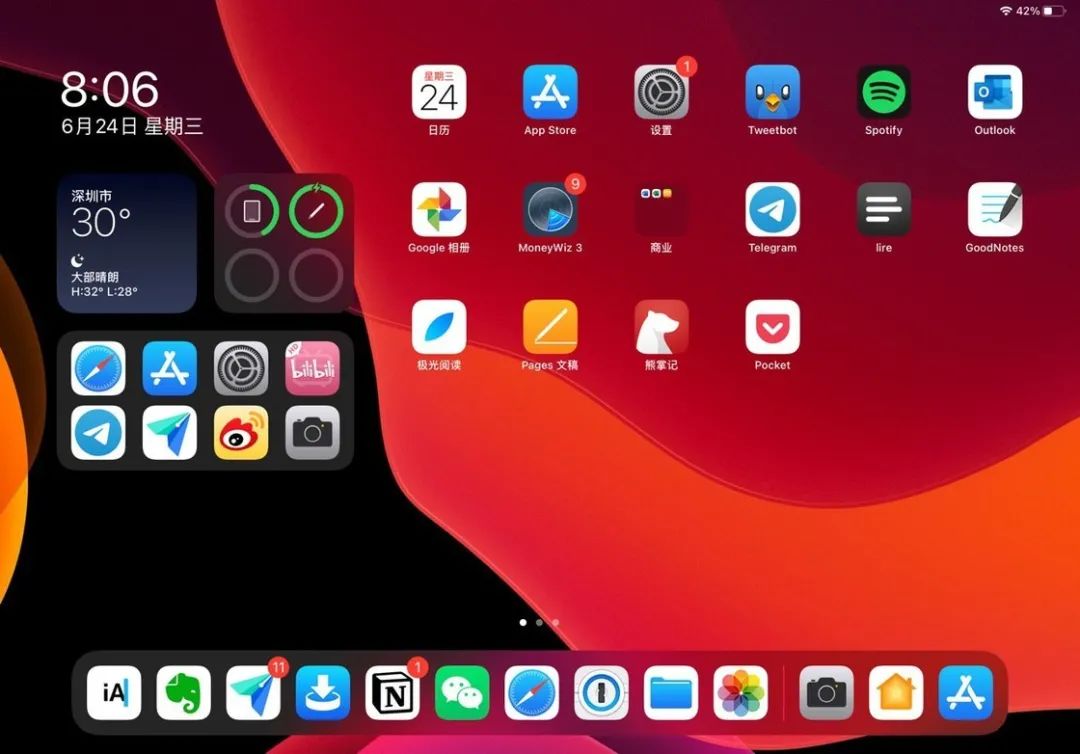 iPadOS 14 也有和 iOS 14 一样的全新小组件,不过,iPadOS 14 不支持将小组件放到主屏幕,只能在屏幕左边的小组件栏里使用它们。