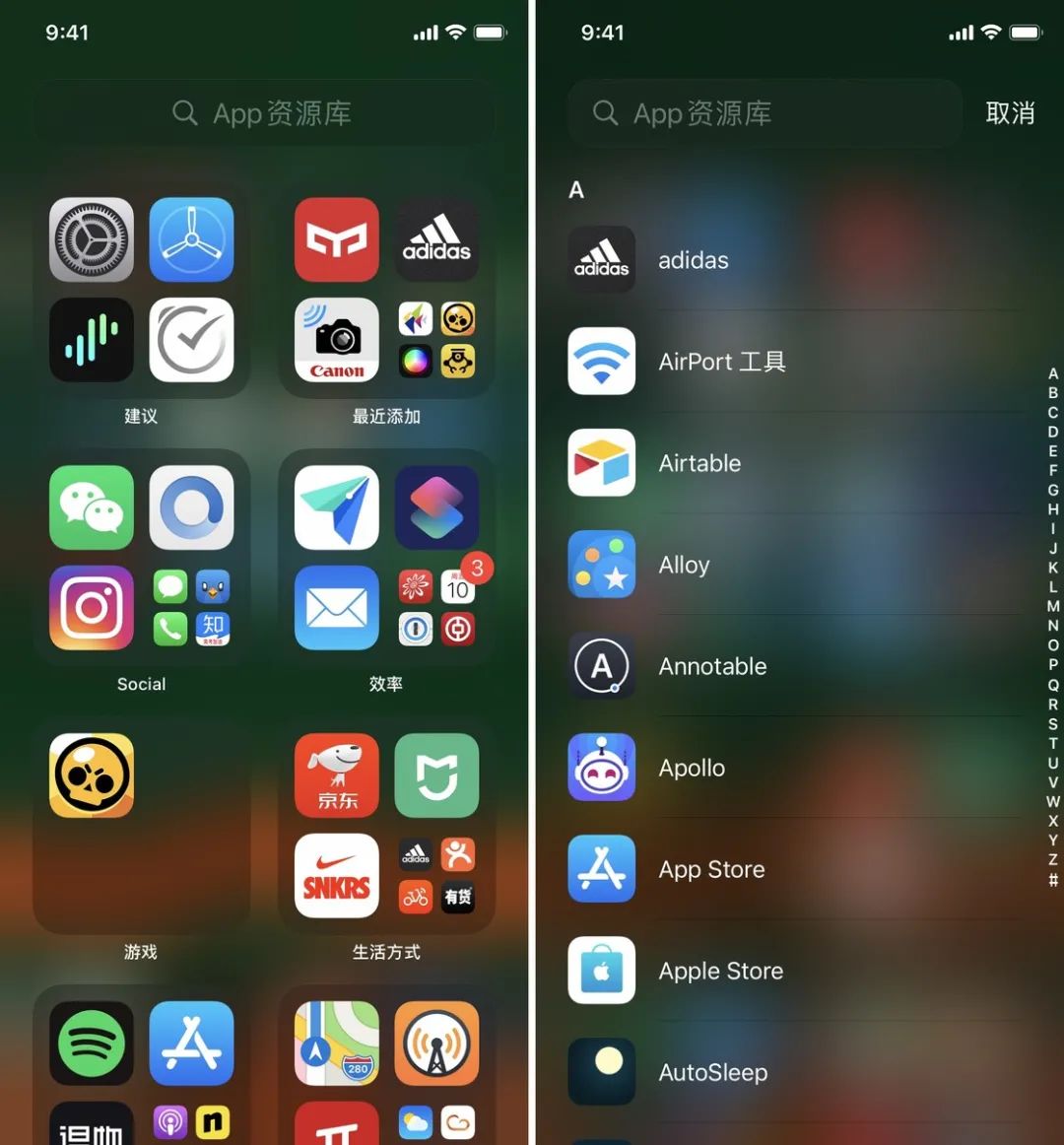 如果你有大量的 iOS app 不知道怎么整理,那么 App 资源库可以帮到你。它会自动整理你的所有 app,在主屏幕的最后一屏,按应用类别生成多个文件夹,比如社交、游戏、工具、娱乐等。点击最上方的搜索框,还能按 app 首字母进行检索。