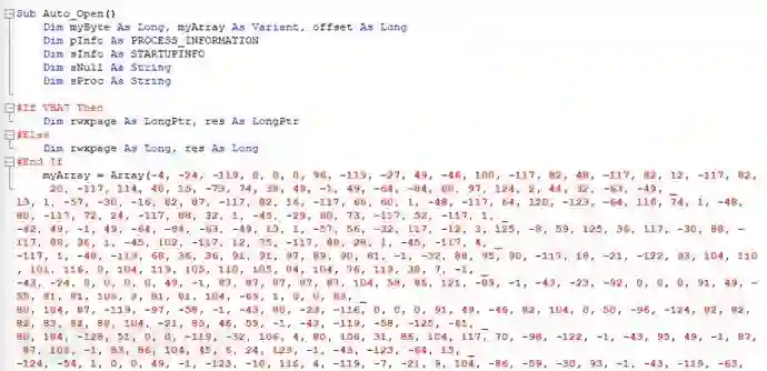 调试宏代码,该样本的宏代码没有经过混淆,可以清晰的看到其将shellcode硬编码赋值给一个数组,这里的数据长这样: