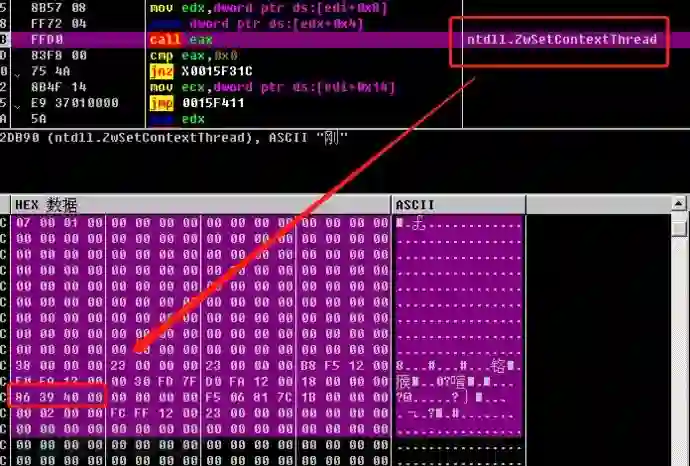 找到上下文地址后,只需要断在CreateRemoteThread或ResumeThread函数上,使用WinHex打开程序要注入的进程,将该上下文地址处的代码修改为JMP到当前地址(或0xCC,此处可以发散一下,只要是能够想办法断下来即可),再单步步过(F8)CreateRemoteThread/ResumeThread,使用OD附加到注入的进程,断在上下文地址处,再将代码修改回原来的代码即可继续执行。