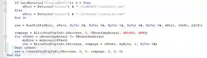 脚本病毒/宏病毒注入shellcode时所使用的函数与PE类略有不同,下面以一个宏病毒的分析过程为例来进行说明。