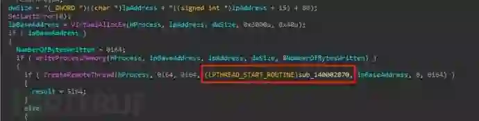 如果是遇到CreateRemoteThread的情况,就比较直观,只要直接找到该函数的第四个参数lpStartAddress,就是我们要找的context值,下图是一个示例:
