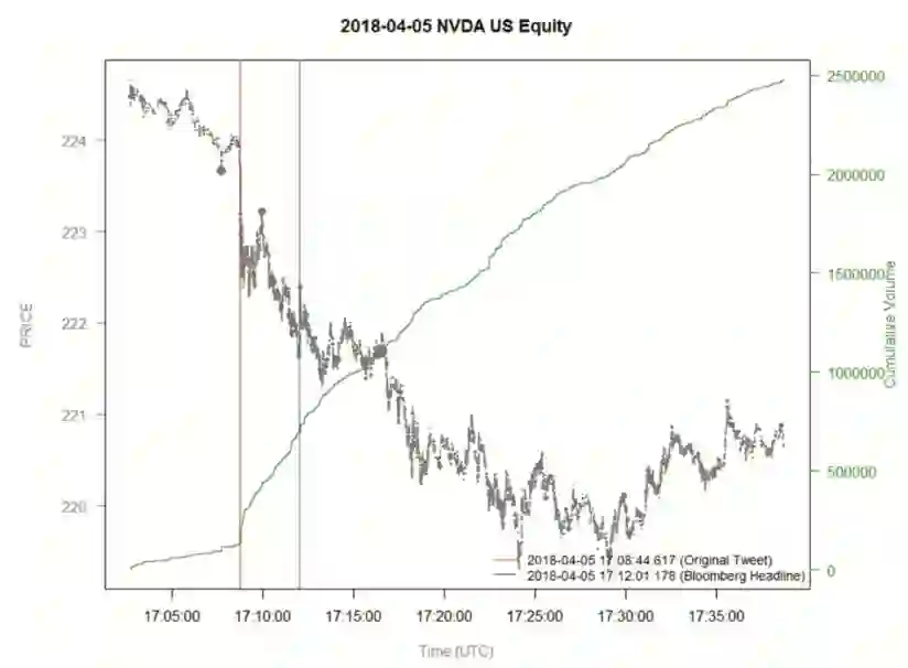 有关英伟达的推特消息发出后,股价的波动情况。市场会在短时间内作出反应。(图片来自 Bloomberg)
