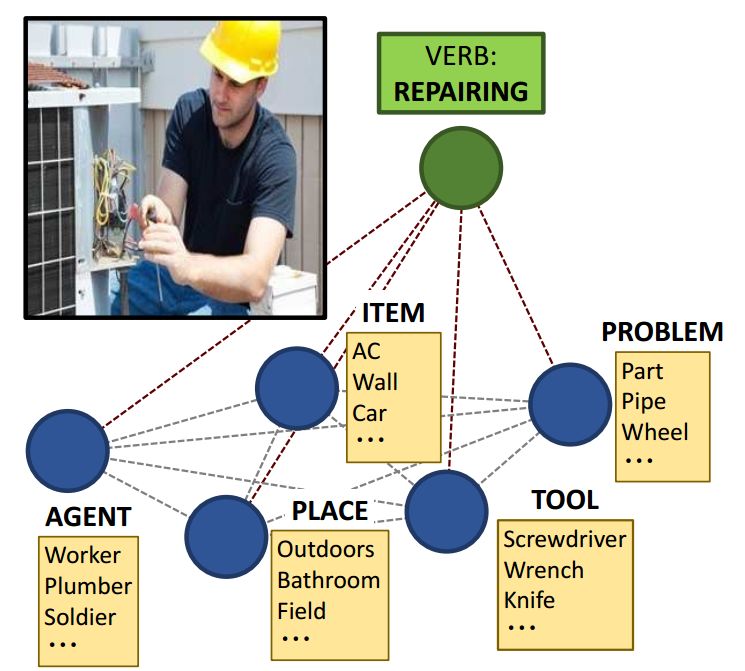 图1. 理解图像不仅仅是预测最显著的动作。我们需要知道是谁在进行这个动作,他/她在使用什么工具,等等。情景识别是一个结构化的预测任务,它旨在预测由多个角色-名词对组成的动词及其框架。该图大致展示了我们的模型,该模型使用图来模拟动词及其角色之间的依赖关系。