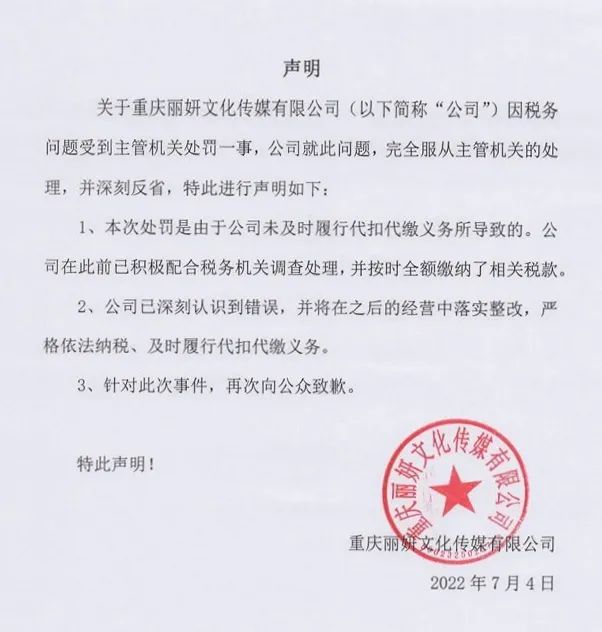 【偷漏税被罚97.8万,袁冰妍工作室致歉】袁冰妍工作室发布致歉声明称,关于税务机关对重庆丽妍文化传媒有限公司作出的处罚,公司深刻反省,并积极配合整改。已及时缴纳款项,在此向公众致歉。据公开信息,演员袁冰妍关联公司重庆丽妍文化传媒有限公司因违反税收管理法,被罚款约97.8万元。袁冰妍已退出公司法定代表人职位。(中华网)